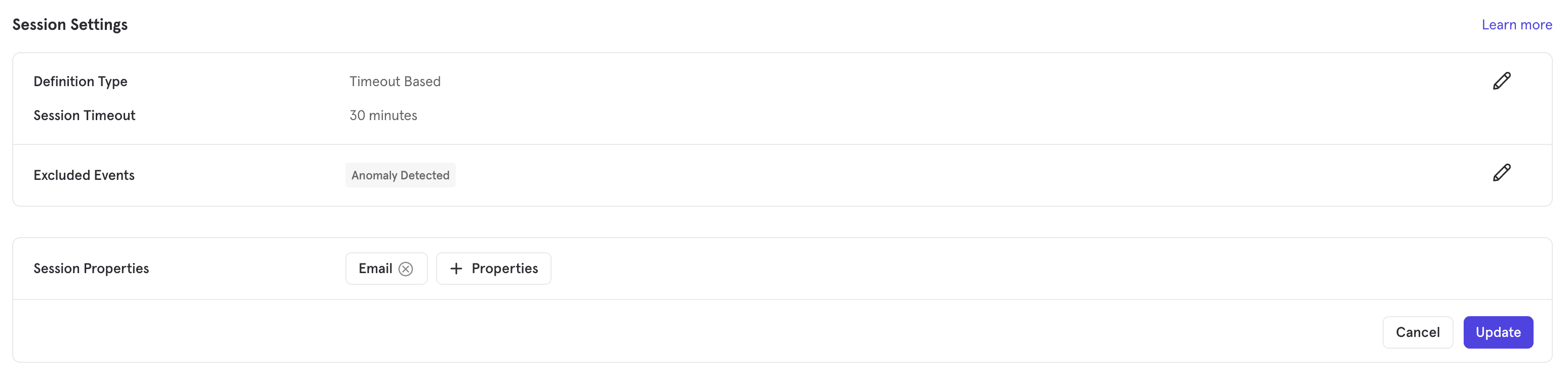 Project Admins or Owners can choose between one of these configurations in Project Settings. Since Mixpanel computes sessions on the fly, you can change this definition at any time and it will apply historically. Read more below.